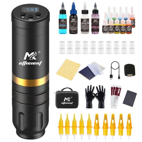 - Complete Tattoo Kit: Includes MK tattoo pen machine,1x USB fast charging cable,10 cartridge needles,20 tattoo ink cartridges,1 bottle of tattoo gel,1 practice skin,2 sheets of transfer paper,1 bandage