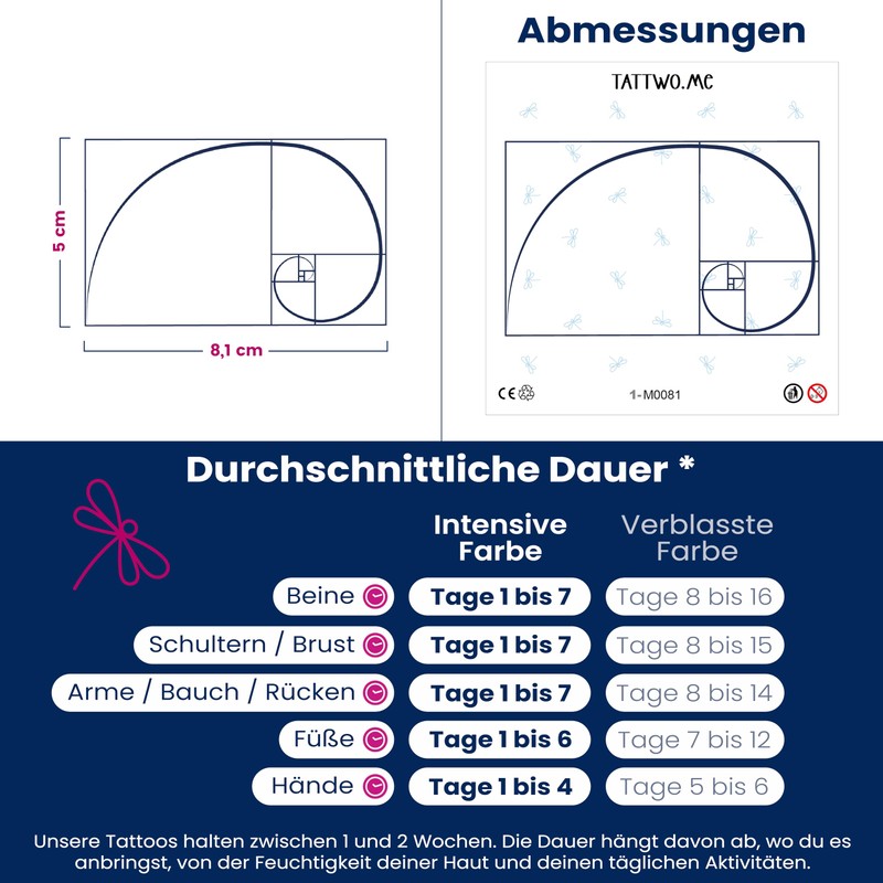 Tattwo.me Temporary Tattoos for Adults and Children 2 Weeks Waterproof - Fibonacci Sequence - Vegetable Ink - EU Cosmetic Certificate - (M0081)