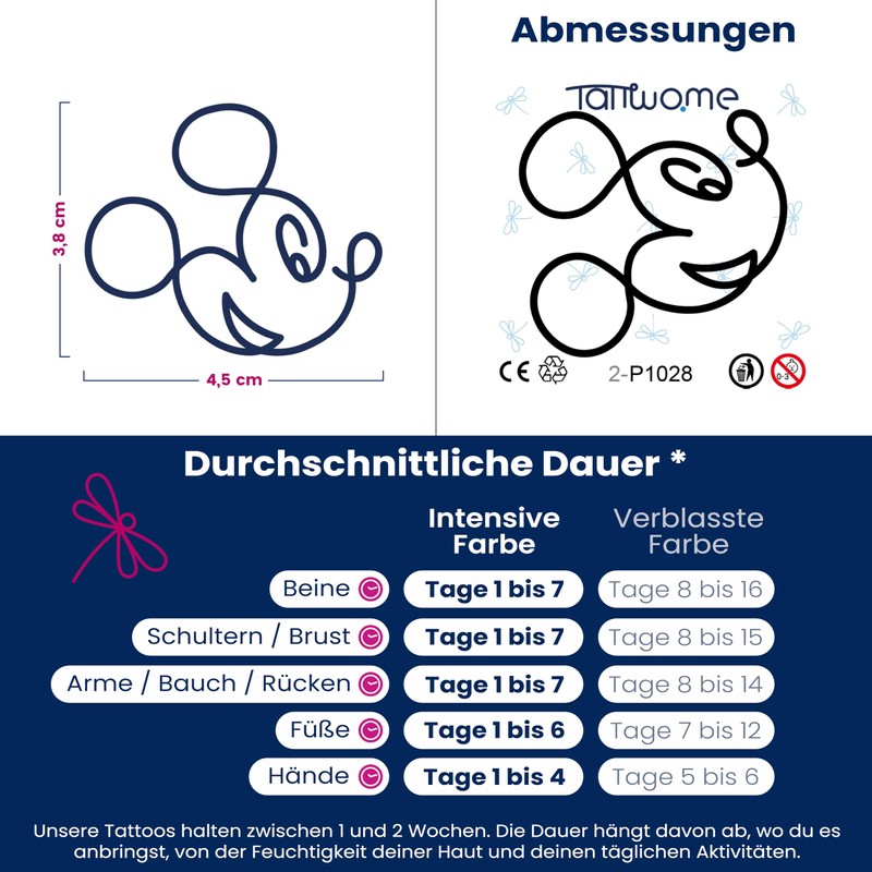 Tattwo.me Temporary Tattoos for Adults and Children 2 Weeks Waterproof - Mickey Head in Line Drawings - Vegetable Ink - EU Cosmetic Certificate - (P1028)