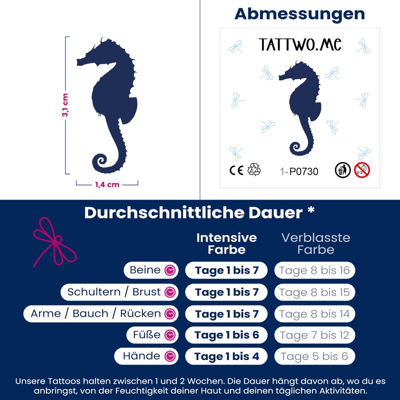 Tattwo.me Temporary Tattoos for Adults and Children 2 Weeks Waterproof - Seahorse - Vegetable Ink - EU Cosmetic Certificate - (P0730)