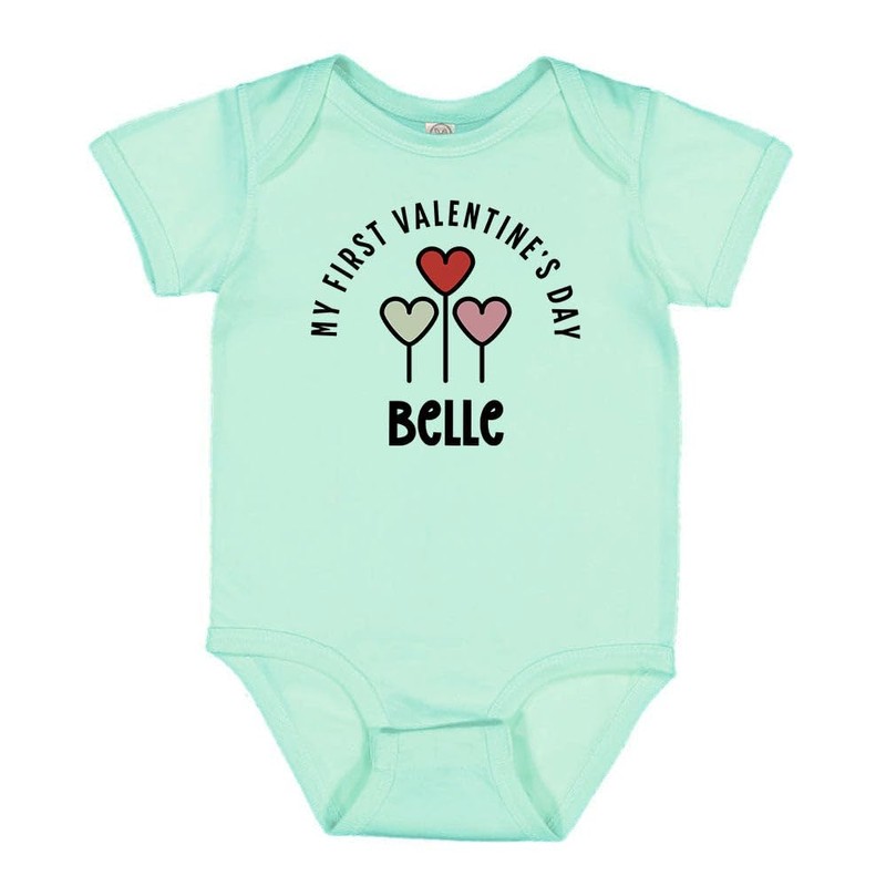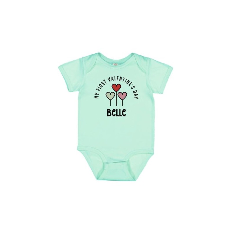 - Celebrate their first Valentine’s Day in style with this personalized design featuring 'My First Valentine's Day' and their name, Belle, making it a uniquely heartfelt gift they'll cherish!
