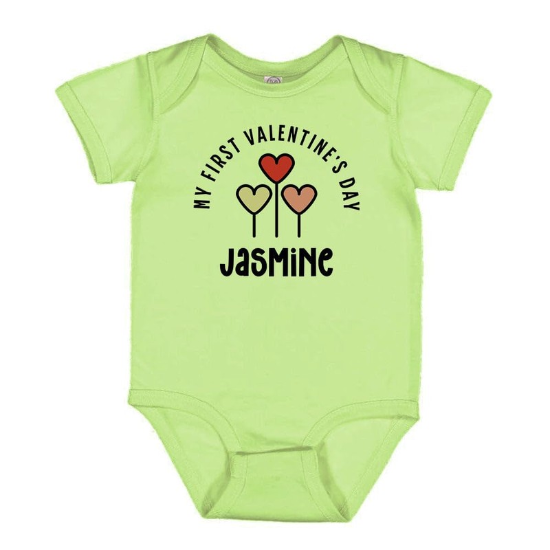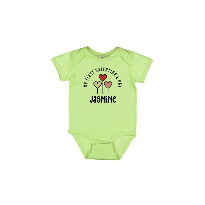 - Celebrate their first Valentine’s Day in style with this personalized design featuring 'My First Valentine's Day' and their name, Jasmine, making it a uniquely heartfelt gift they'll cherish!