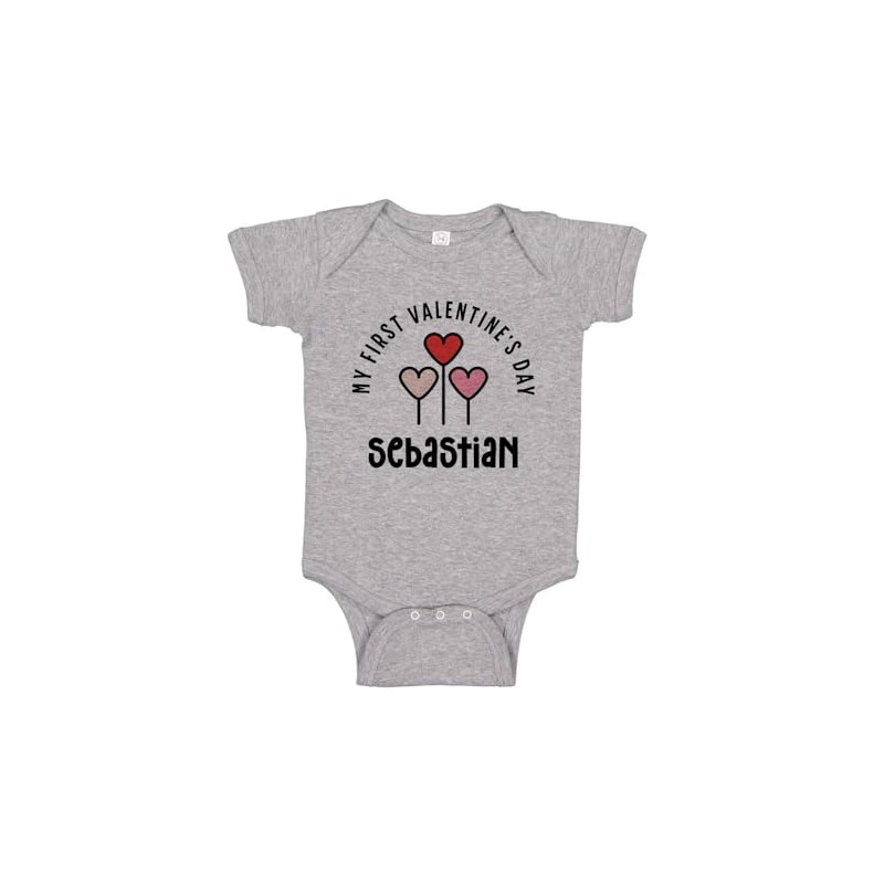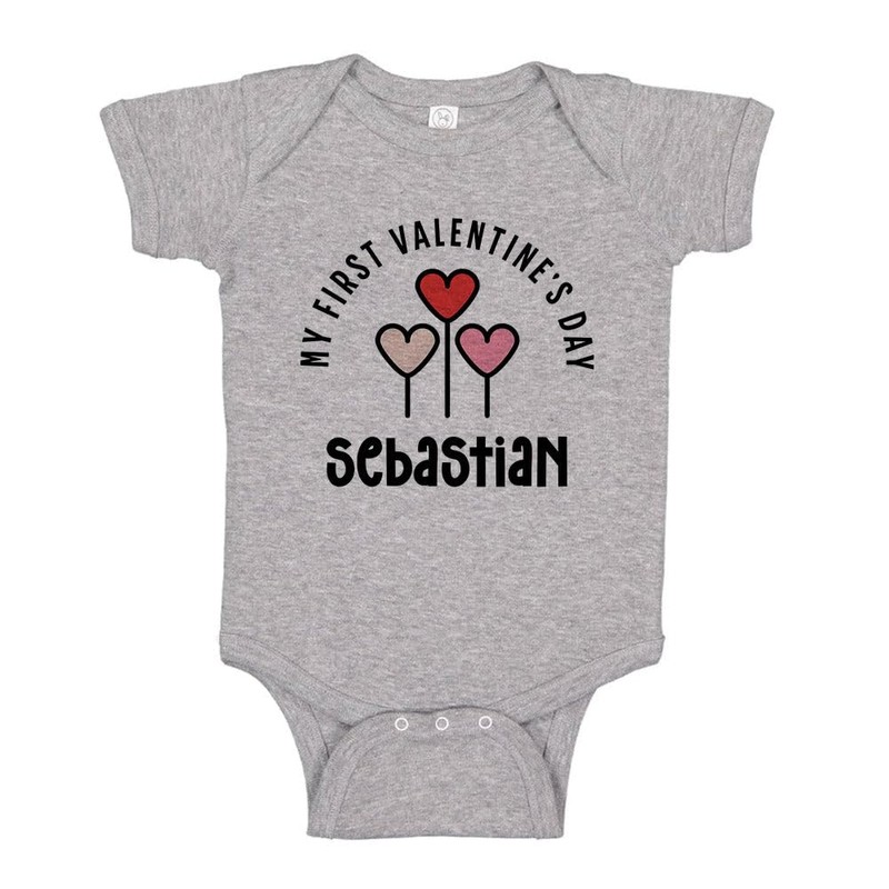 - Celebrate your little one’s first Valentine’s Day with this adorable custom design! Featuring the phrase "My First Valentine's Day" and personalized with the name “Sebastian” to celebrate!