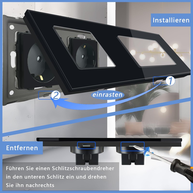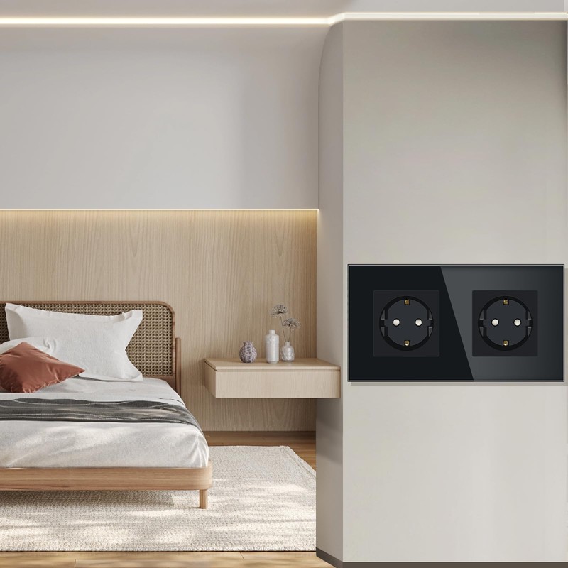 - TAWOIA Schuko socket, EU standard 2-way socket glass flush-mounted socket, sockets with crystal glass plate, double wall sockets, black, 86 x 157 mm