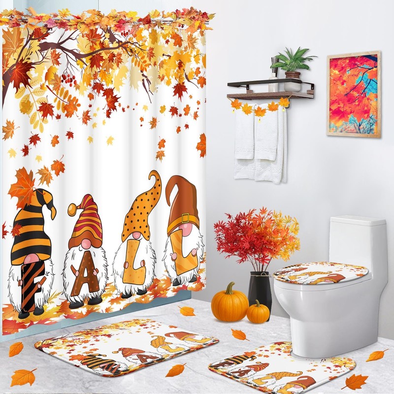 Tayney Fall Gnomes Shower Curtain Set with Toilet Lid Cover and Non-Slip Rugs, Autumn Maple Tree Leaves 4 Pcs Shower Curtains for Bathroom, Cute Bathroom Set Decor