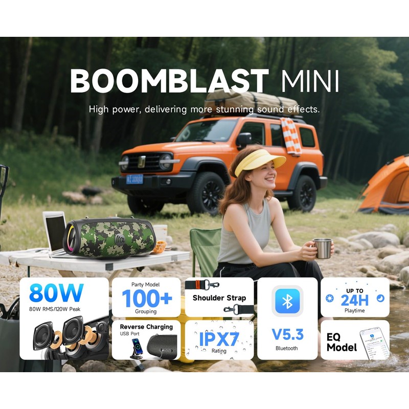 • 60W RMS/90W Peak Power with Triple Passive Radiators – Unmatched Deep Bass TAZATA BOOMBLAST MINI CAMO delivers powerful 360° surround sound with 2×20W subwoofers + 2×10W tweeters, enhanced by triple passive radiators for deep, distortion-free bass. Perfect for outdoor parties, beach trips, or indoor gatherings—experience crisp highs (up to 20kHz) and rich mids like no other compact Bluetooth speaker