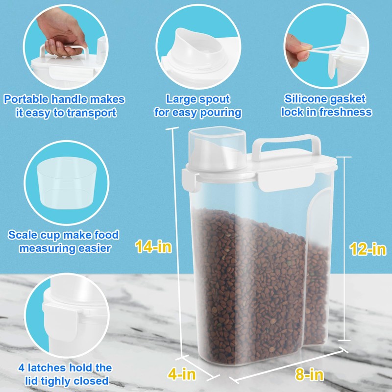 - AIRTIGHT DOG FOOD CONTAINER - With the snap-lock latches and silicone gaskets, the dog food dispenser can shut tightly to seal in freshness. You dog or cat won't open the container and make a mess any more.