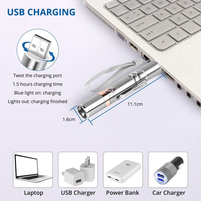 - Multiple Function: The cat toy can also make you a presenter. It is very bright. Plus, you can turn on the switch with a single press. White mode can glow in the dark; Purple mode can detect money