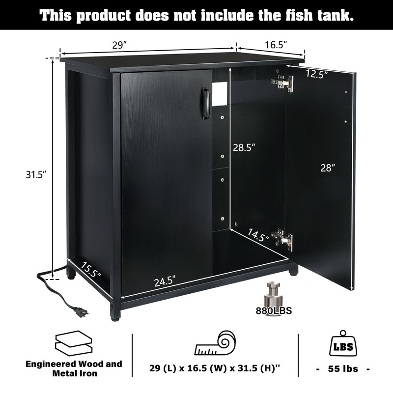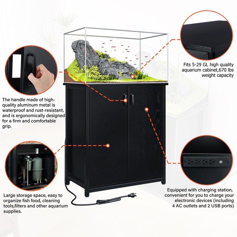 - 【Multi-functional Fish Tank Cabinet】This is a fish cabinet made for the fish hobbyist that will meet all your fish keeping needs. The top holds a large 5-29 gallon aquarium and the bottom has a large drawer for storing fish feed, filters, and other aquarium supplies. It has a charging station inside to provide a stable power source for your aquarium equipment. Size: 29 (L) x 16.5 (W) x 31.5 (H)''