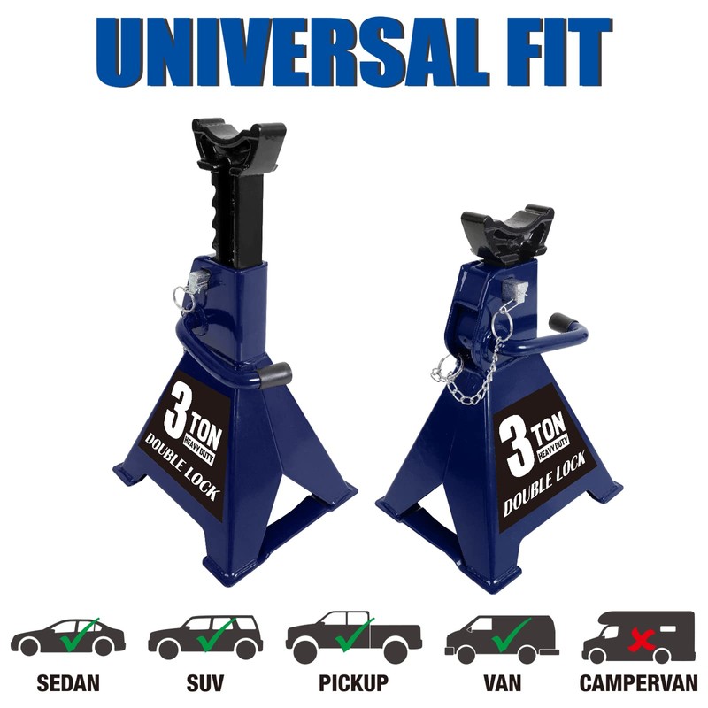 - Double locking jack stands are constructed with high-quality, solid steel body panels and welded-in reinforcement braces for added strength and durability
