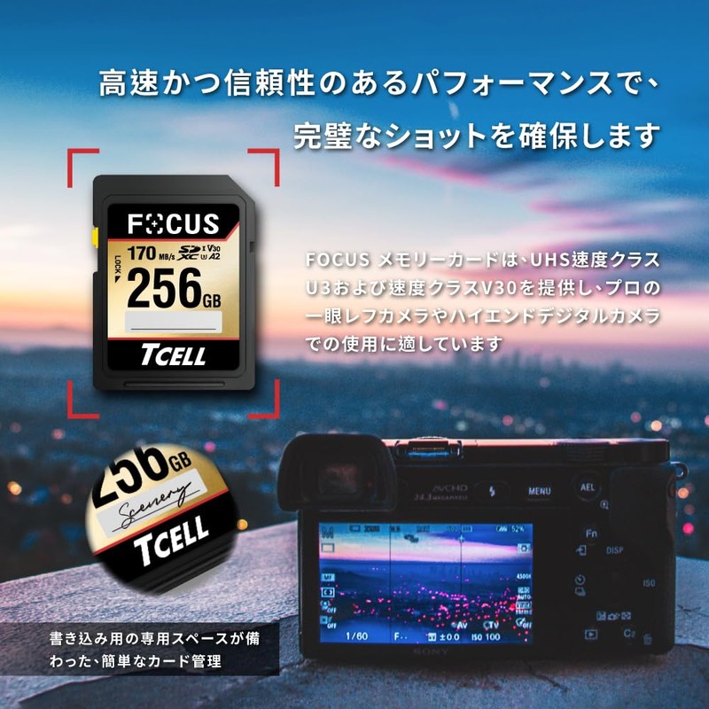 TCELL FOCUS Taiwan SD Card 256GB A2 SDXC UHS-I Memory Card U3 V30 High Speed 4K UHD & Full HD Video (Max Read Speed 170MB/s Max Write Speed 125MB/s) Compatible with Canon Nikon Digital Camera SLR