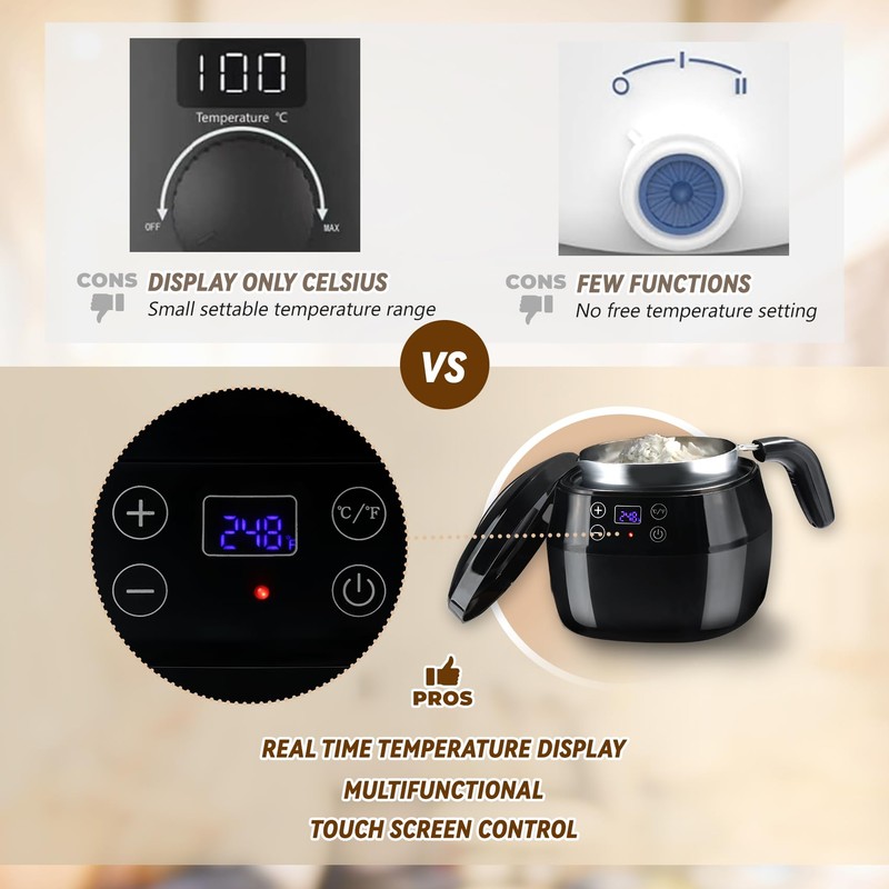 - Efficient Heating: The aluminum pot heats up swiftly, allowing you to start your candle-making process without delay. The temperature will reach up to highest temperature first to accelerate wax melting then lower to set temperature.