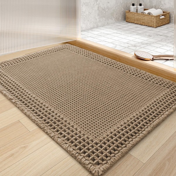 tchdio Waffle Bath Mat - Super Absorbent Bathroom Rugs Non Slip Washable, Quick Dry Bathroom Mat with Tassels, Boho Bath Mat Ultra Soft Bath Rugs for Bathroom Floor, 18"x30" Brown
