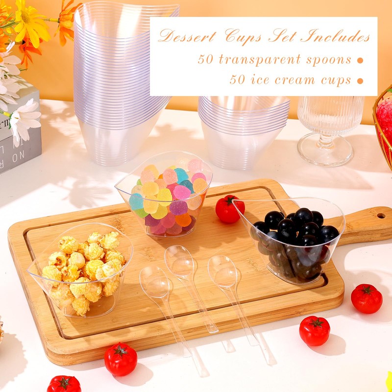 - Package Includes: This dessert cup package includes 50 7oz Square plastic dessert cups and 50 spoons. Suitable for group gatherings and enjoying happy times at the same time