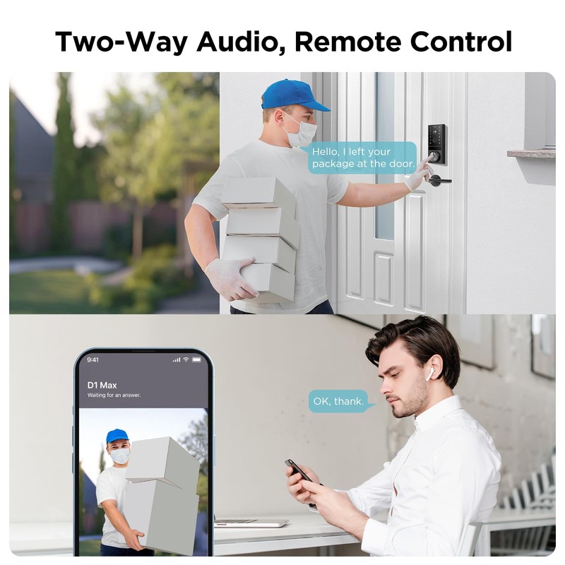 - 𝐌𝐮𝐥𝐭𝐢𝐩𝐥𝐞 𝐃𝐨𝐨𝐫 𝐔𝐧𝐥𝐨𝐜𝐤𝐢𝐧𝐠 𝐌𝐞𝐭𝐡𝐨𝐝𝐬: Unlock your front door using the app, fingerprint, keypad code, or traditional keys. No more fumbling or worrying about lost or duplicated keys. The AI fingerprint sensor offers a quick, secure entry, ensuring only authorized access.