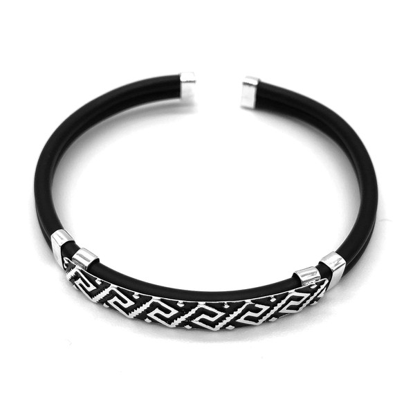TClaudia, Pulsera de plata para hombre con piel color negro, accesorio ajustable. Placa con grabado artesanal y terminales en plata 925. Esclavas, Pulseras y Brazalete hombre.