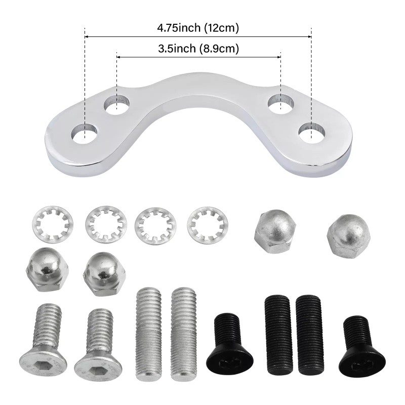 Adapter is used on front springer forks and adapts 4-3/4" riser holes to standard 3-1/2"