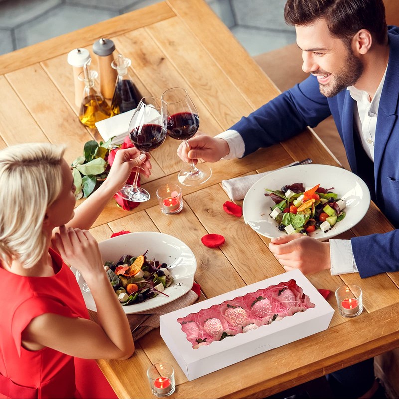 • These bakery boxes are perfect for cookies, chocolate strawberries, chocolate covered fruit, mini cupcakes, muffins, macarons, or any other baked goods.