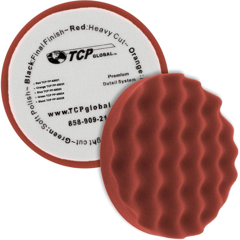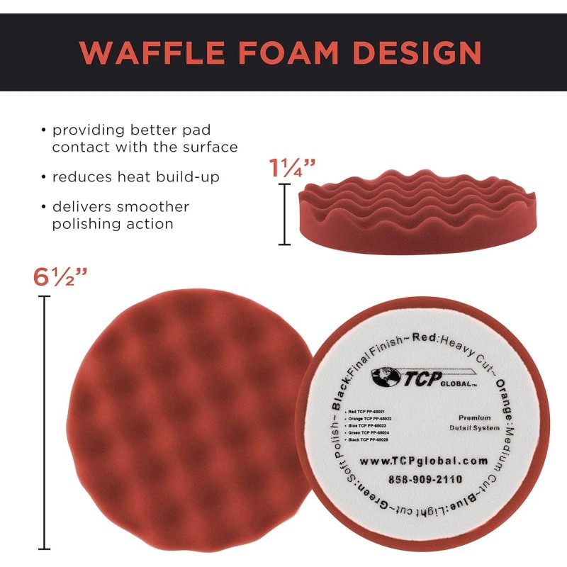 TCP Global 6.5" Red Waffle Heavy Cut Grip Foam Polish Buff Pad - DA Hook &...