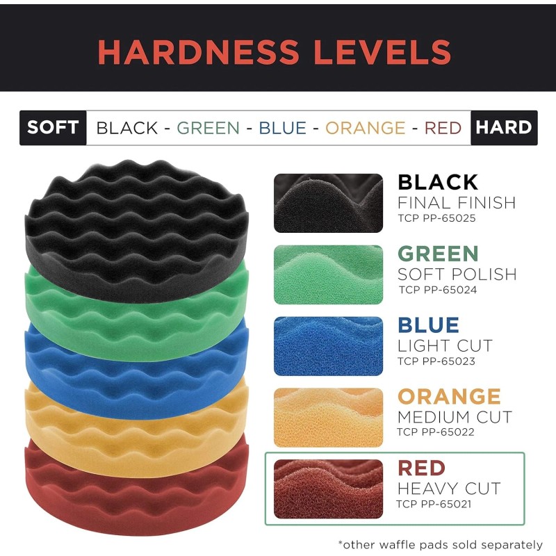 - Our Red Waffle Pad has the coarsest foam, designed to remove heavy oxidation, swirls, and scratches from neglected finishes