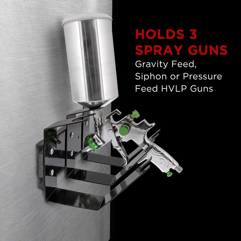 - Holder includes 3 support positions to fully cradle 3 full size or detail gravity feed guns. Siphon or pressure feed spray guns can also be hung from the lowers 3 hooks of the holder.
