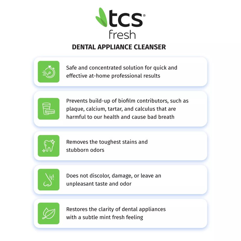 - PROFESSIONAL STRENGTH DENTAL CLEANER FOR APPLIANCES - TCS Fresh Concentrated Dental Appliance Cleaner is a powerful solution that utilizes advanced ingredients to effectively dissolve away tough stains and leave your dental appliance looking like new.