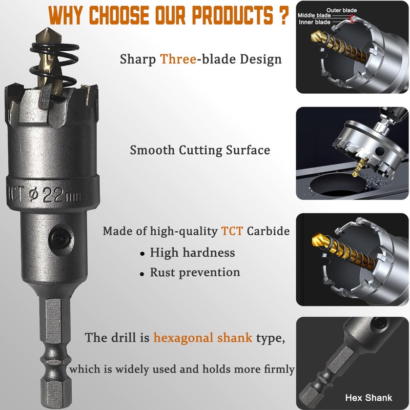 - 【Premium Quality Material】The carbide hole saw kit is constructed from high-grade TCT alloy, ensuring exceptional hardness. Hole saw teeth designed with three-blade, includes outer blade, middle blade, and inner blade, making it sharper. Spring can protect the core drill and teeth to auto popup the cutting waste.