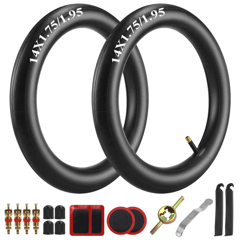 - PACKAGE INCLUDED: 2 x Inner Tube, 4 X Black Stem Valve Caps, 4 X Self-Adhesive Patches, 2 x Black Tire Lever, 4 X valve core, 1 x Valve Core Wrench, 1 X Metal Cleaning Rasp