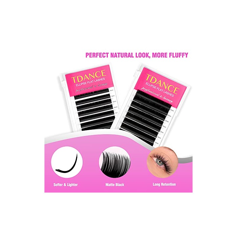 - THE NEWEST STYLE: Split Tips. Ellipse flat eyelash extensions are black, Matte lashes extensions,Not too bright greasy.Ellipse lashes are perfect if you want a fuller, longer look without the added weight to your natural lash. Great for those still looking for a dramatic look but natural lashes are finer.The eyelash more softer.