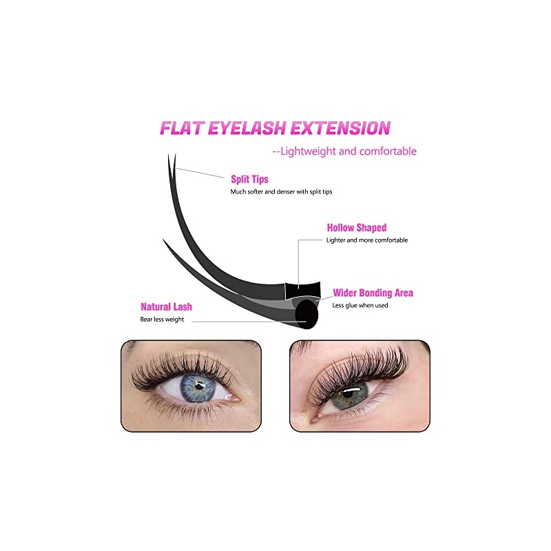 - QUALITY: Made With High Quality False Mink Silk Eyelash Extensions,Soft,Light and Comfortable.The eyelash extensions are all 100% HANDMADE by our workers.Upgraded from traditional eyelash extensions,flat lash extensions extend more 20% time to duration due to its new physical structure with bigger contact area.