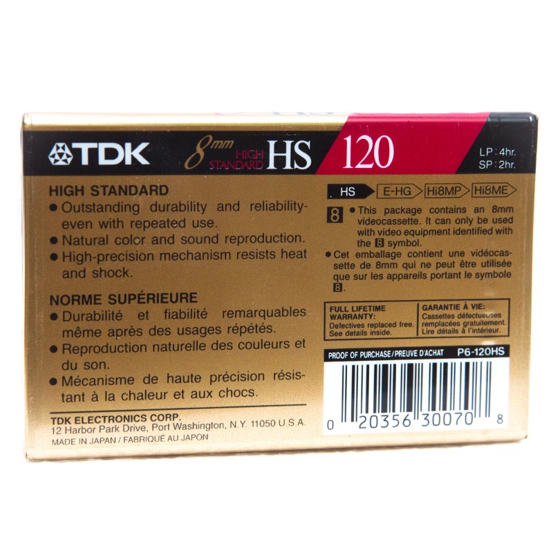This listing is for One TDK HS120 High Standard 8mm Video Cassette.