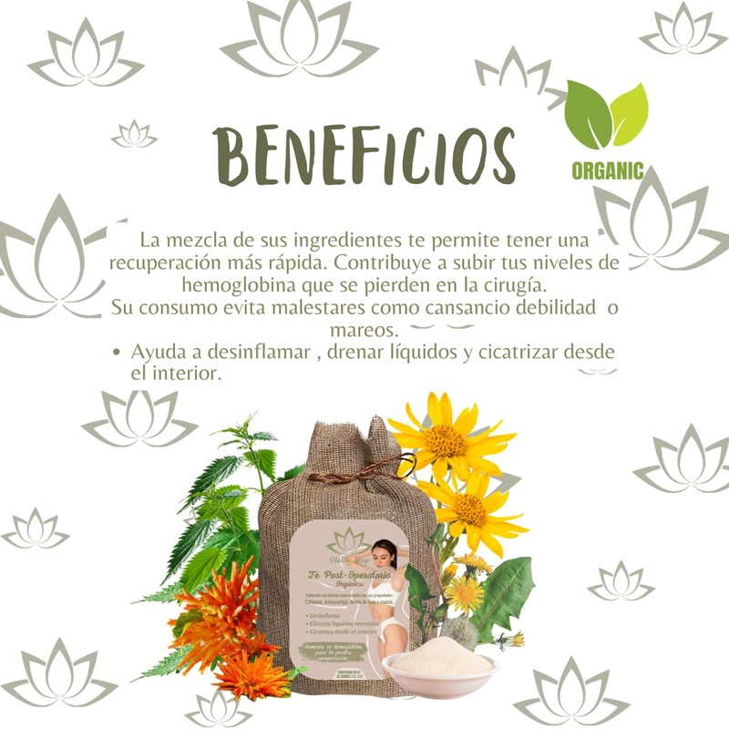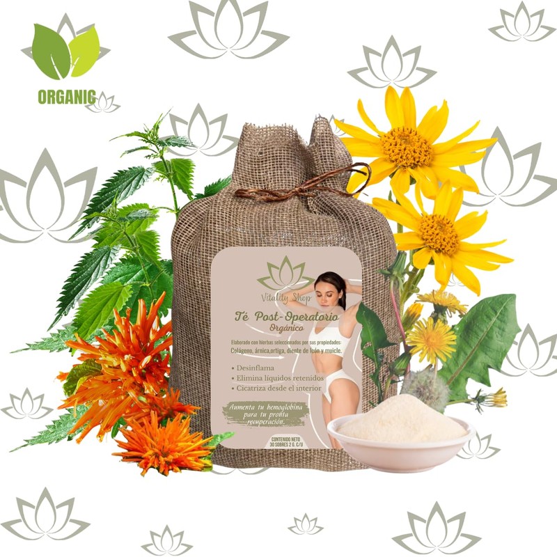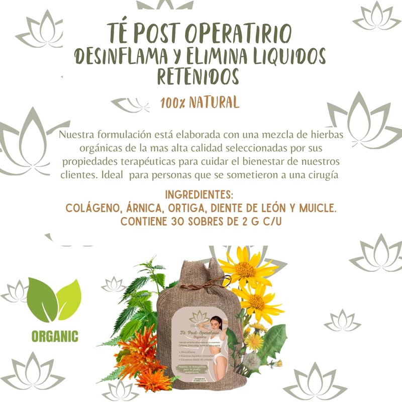 Te Post Operatorio Elaborado con : Colageno,arnica ortiga, te verde. Contiene 30 sobres de 2 g c/u BENEFICIOS : La mezcla de sus ingredientes te permite tener una recuperación más rápida. Ayuda a desinflamar. Uso sugerido : Tomar 4 tazas al día