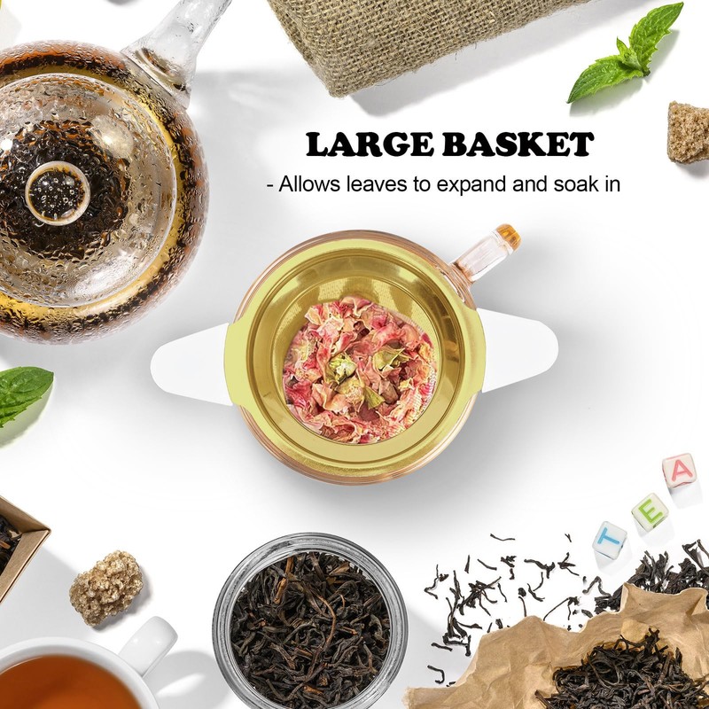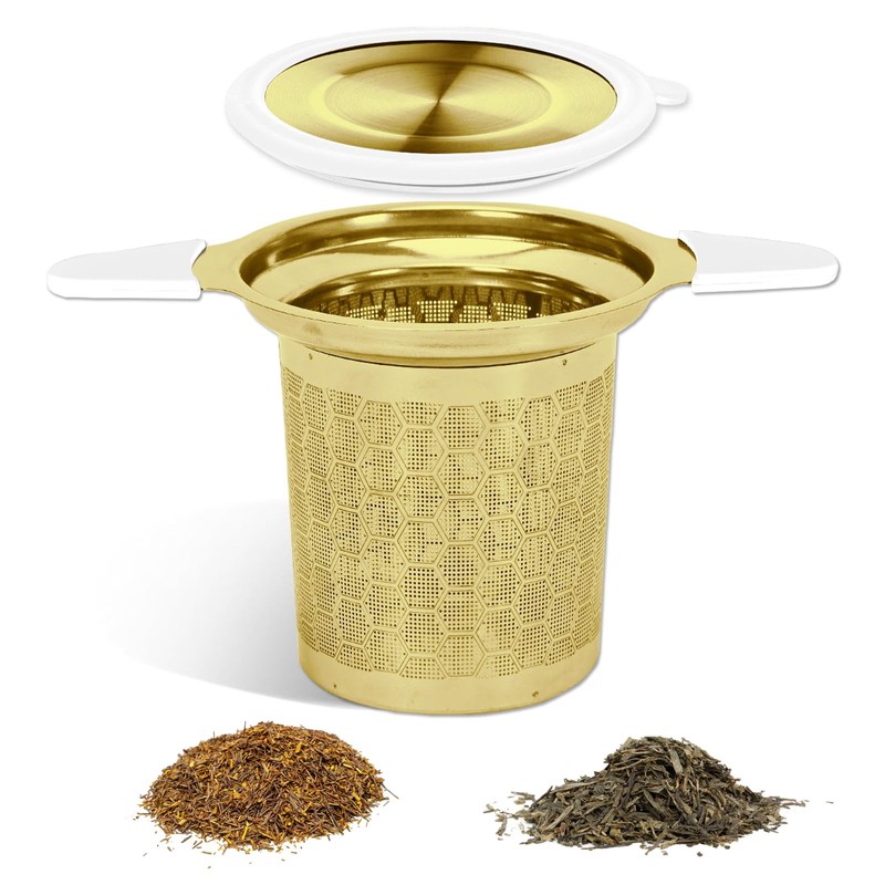Tea Infuser for Loose Leaf Tea, Extra Fine 304 Stainless Steel Tea Strainer Stepper with Heat-Resistant Silicone Handles and Lid, Large Capacity Tea Basket Filter for Mug, Cup (Gold)