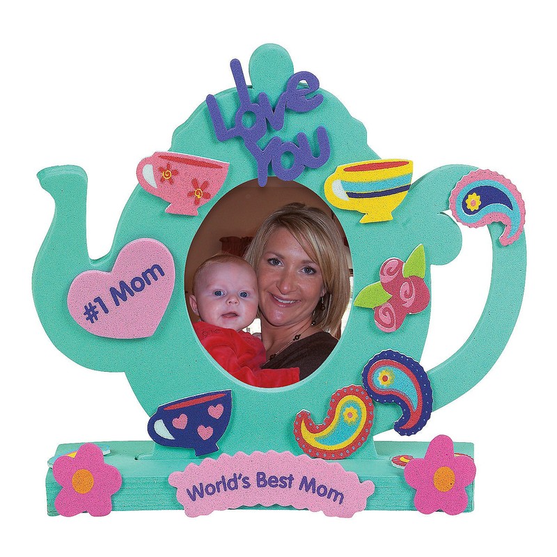 - TEAPOT-SHAPED DESIGN: This adorable picture frame craft kit features a teapot-shaped design that comes with assorted colors and shapes self-adhesive decorative foam cutouts such as "World's Best Mom", teacups, and more.