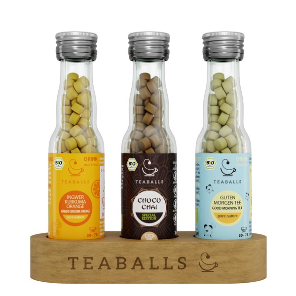 Discover the new Teaballs organic set of 3 with the exclusive variety CHOCO CHAI - a special edition, developed for the Naturally Pam advent calendar. Perfect for the cold season and a conscious diet. Give your winter routine an extra dose of cosiness with this tea set. Start the day with the refreshing Good Morning tea, enjoy the soothing spice of ginger turmeric orange tea and discover the chocolaty highlight CHOCO CHAI with 100% real organic cocoa. This set contains: 1 x bottle of Teaballs organic chocolate chai, 1 x bottle of Teaballs organic ginger turmeric orange, 1 x bottle of Teaballs organic good morning tea, 1 x premium wooden stand for stylish storage. With Teaballs you will experience quick and easy preparation. Simply dissolve 4-5 Teaballs organic in 200 ml of boiling water or milk, stir, let settle and enjoy. The cocoa base is drinkable and provides an intense taste experience. Perfect for a healthy diet: sugar free, gluten free and lactose free.