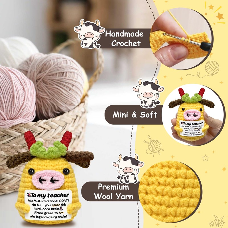 - Multi-functional: This compact, crocheted keepsake offers heartfelt gratitude and can accompany the teacher everywhere. Its uplifting card is an enduring tribute to educators, while the cow serves a dual purpose as a stress-relief companion and charming decor for desks or cars—a thoughtful blend of appreciation and practicality.