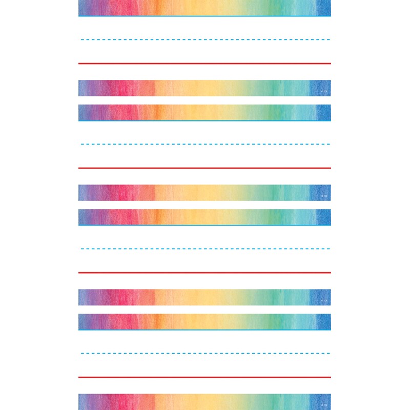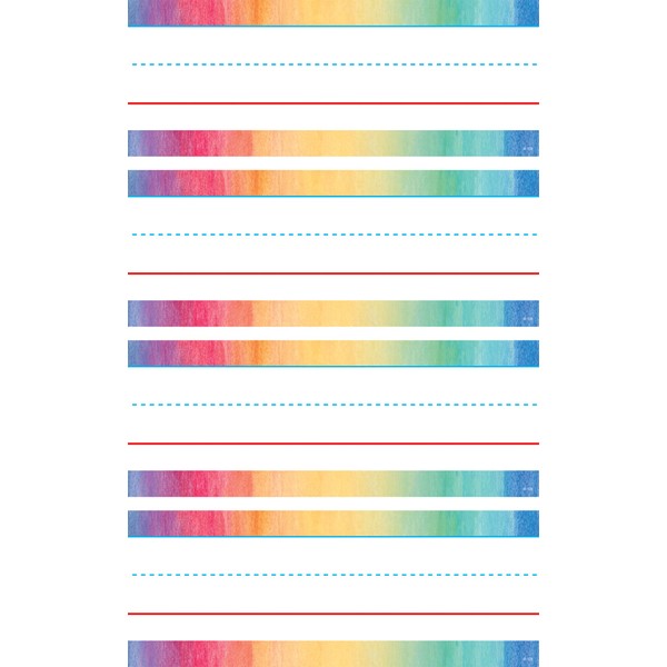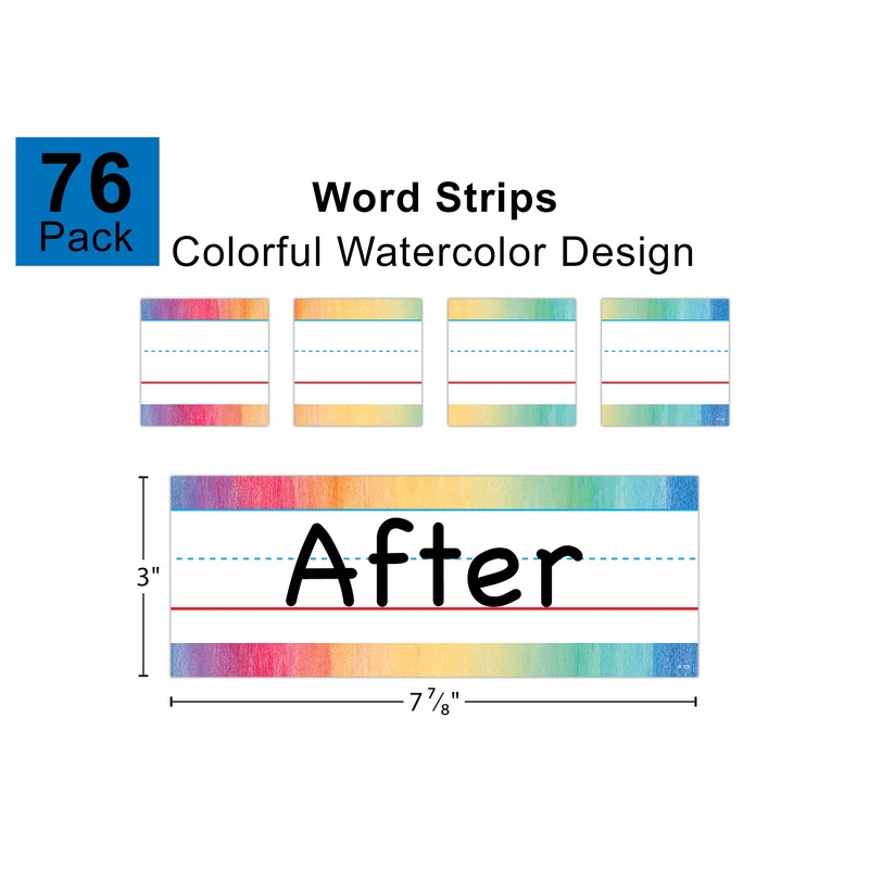 These Watercolor Word Strips feature a colorful design. Single sided; 1½" ruling with ¾" dotted guideline. 76 strips. 7⅞" x 3".