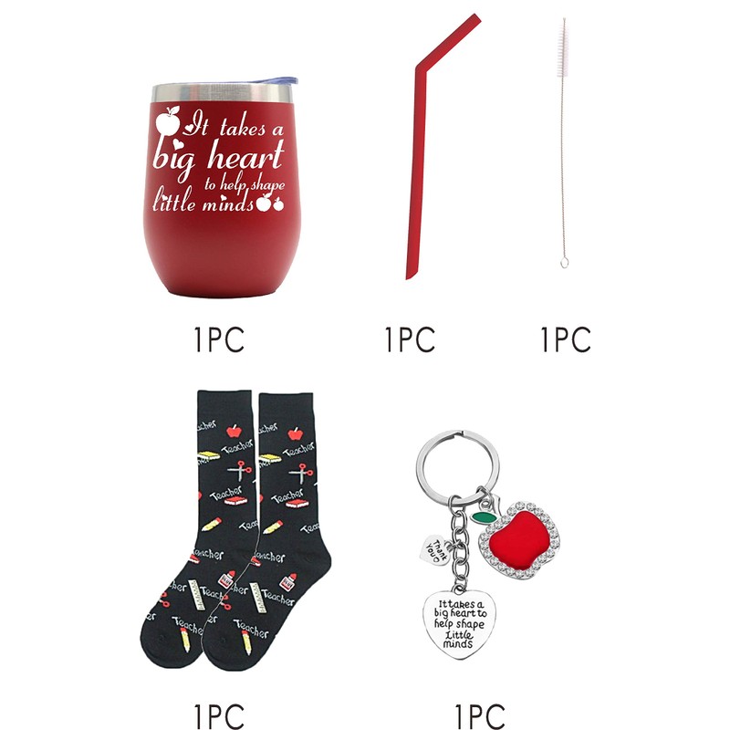 - Teacher Inspirational Gift: An awesome ideas gifts for Teachers or New Teachers. The Teacher Appreciation Gift set contains one Teacher Mugs printed with wording "Its takes a big heart to shape little minds”alongs with matching color straw and cleaning brush, one Teacher Keychain engraved with wordings “Its takes a big heart to shape little minds”, and one Teacher Socks for Women