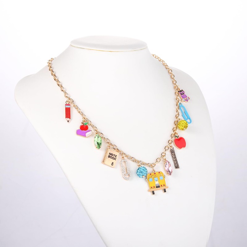 - School Themed Pendant Jewelry Set--The back-to-school jewelry set include colorful enamel charm pendant necklace and a charms bracelet.Add some sparkle to your teacher outfits with these school-themed necklace bracelet accessories like pencils,school bus, crayons,books,crystal,Paper clip,and more on jewelry set.