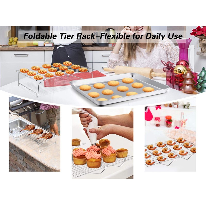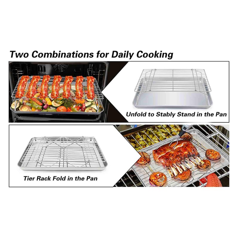 - 🍖EXQUISITE CRAFT RACK: Accompanying tier cooling rack(15”×10”×3.5”)perfectly fit in the baking pan, Adjustable legs with curved design for easily folding or swinging open to stably stand in the pan, Designed with dense parallel lines allow fast and even air flow for cooling / baking / roasting, Weld firmly and last a long time
