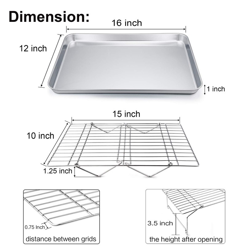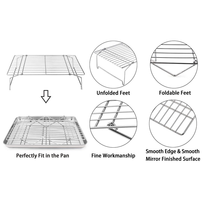 - 🍤OVEN & DISHWASHER SAFE: Cookie sheet pan and wire baking rack are oven proof, Superior smooth mirror finish surface keeps shiny and good look, Conductive to effortless release, Dishwasher safe to save your labor and avoid hassle, Make life more easier
