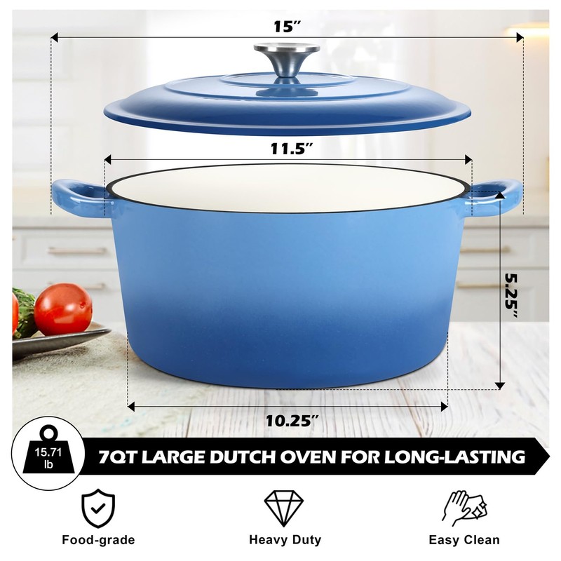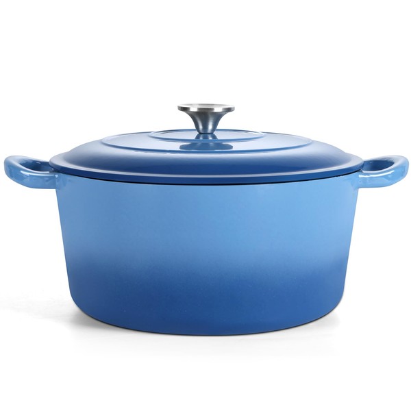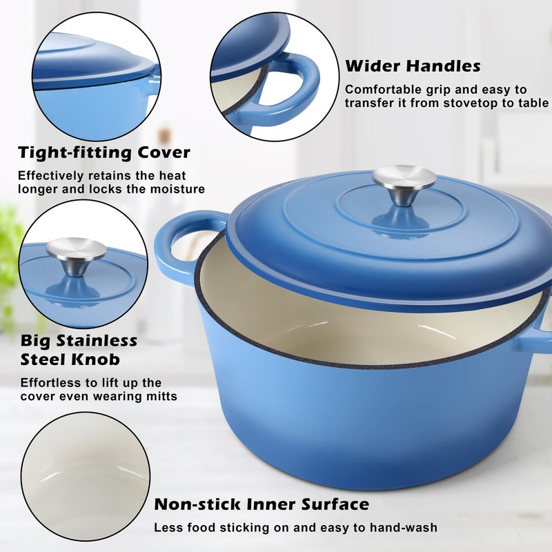 TeamFar Enameled Cast Iron Dutch Oven, 7qt Dutch Oven Pot Nonstick Cookware with Lid & Dual Handles for Bread Baking, Cooking, Oven Safe up to 500℉ & Various Stovetops, Healthy & Heavy Duty - Blue