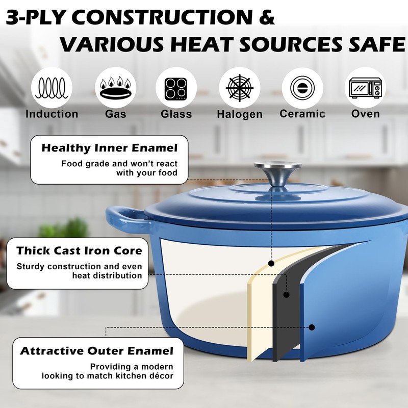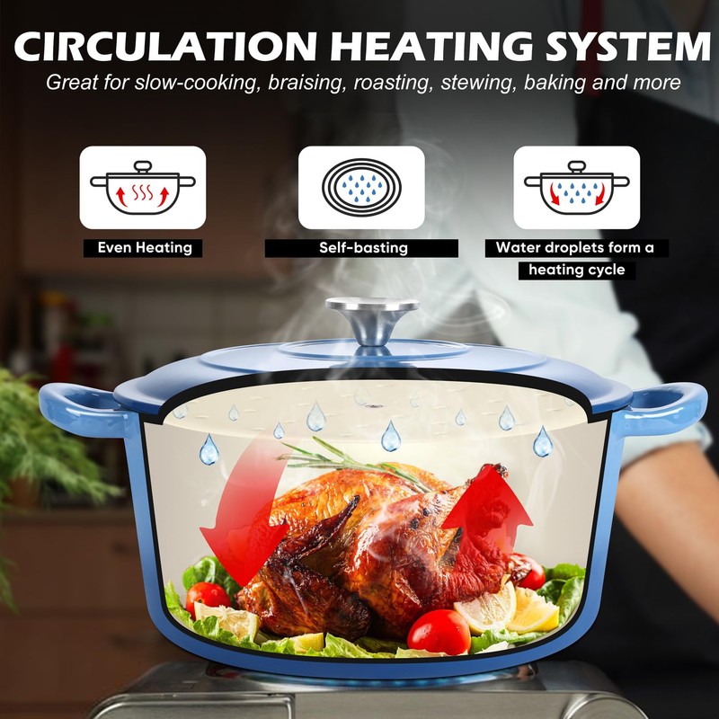 - EVEN HEAT DISTRIBUTION & VARIOUS STOVETOPS SAFE - The cast iron pot distributes and holds heat evenly to food throughout, Making it a breeze to cook everything with consistently excellent results whether you are a home cooking or professional chef, This enameled cast iron dutch oven works well on various kinds of cooking stovetops, Including induction, gas, electric, ceramic, glass, Also oven safe up to 500℉