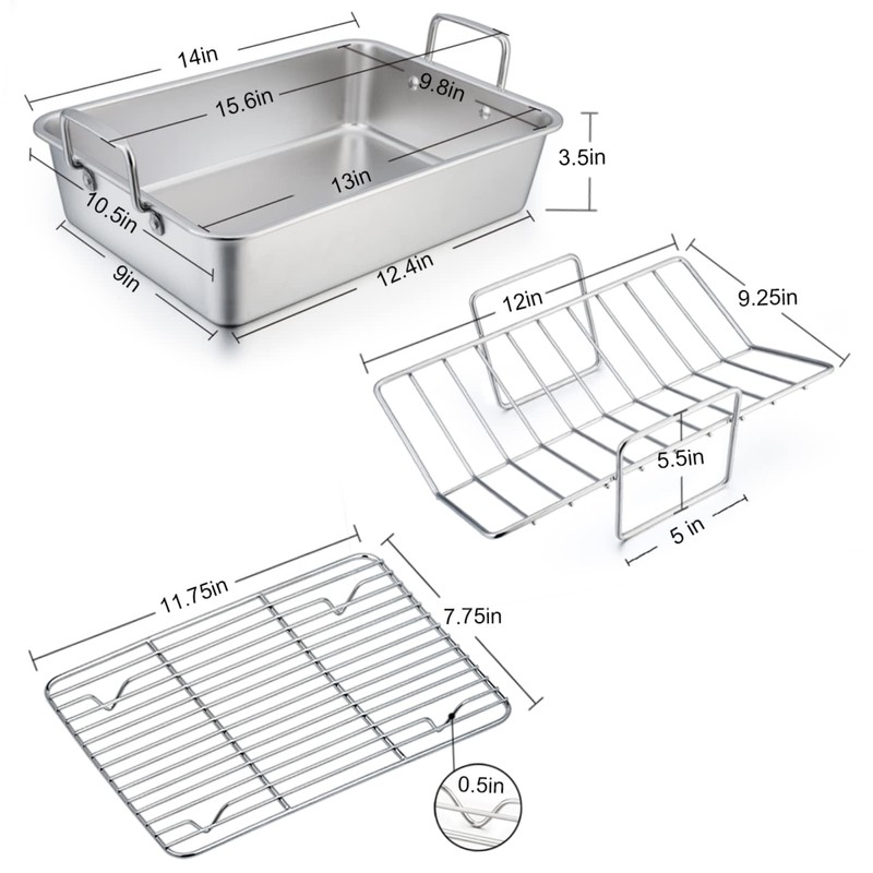 - MULTI USE: The Roasting pan is perfect for Baking lasagnas / vegetables, Removable V-rack is ideal for roasting turkey / brisket, Flat cooling rack greatly fits in other medium or large baking pan, Separately cooling dessert / baking meat, Great set for daily cooking and holiday entertaining like Thanksgiving and Christmas…