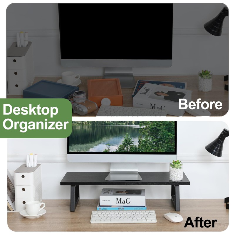 - 【Storage Space Underneath】The Stand made of thickened steel frame can hold 150Ibs, strong and sturdy. It can storage your keyboard, cords, pens, office supplies, etc, and makes cable management pretty easy. Ergonomic design, relieves eyesight and back fatigue during work.
