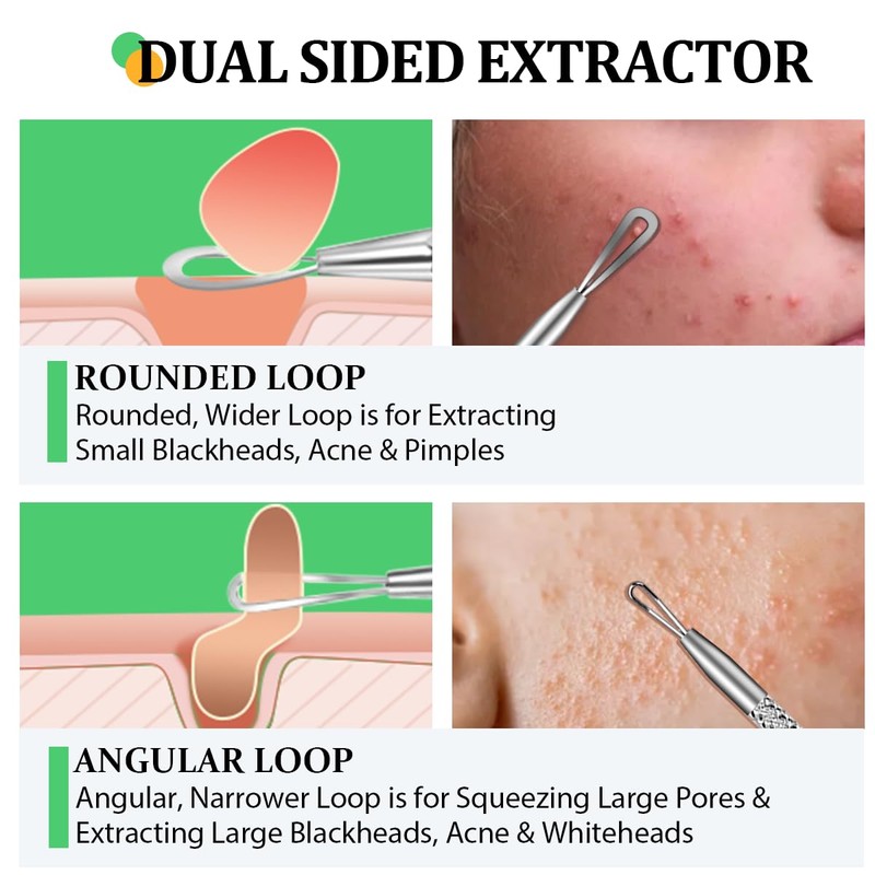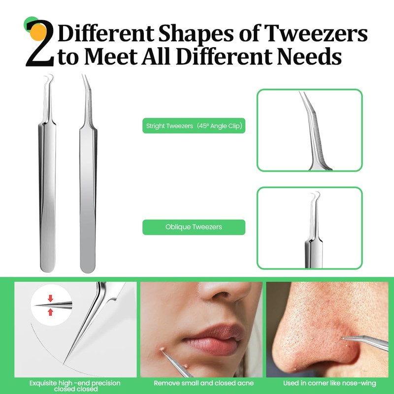 - Dual Head Design: This pimple popper tools kit has 2 types of extractor tips, needle and tweezer. Each needle have 2 heads. These practical blackhead and comedone acne pimple extractors will help us to remove blackheads, acne, and various blemishes easily.