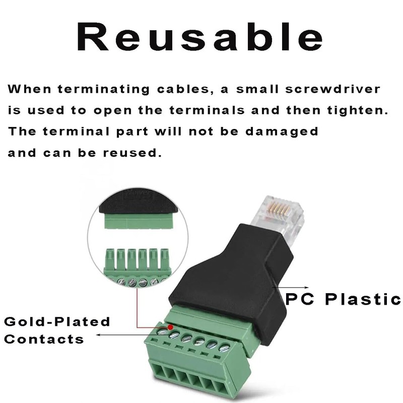 • Solderless Type - No soldering required, easy to use, just a screwdriver and a wire stripper to terminate RJ12 cables, the wiring is very tight,saving time and trouble for installation personnel,and it's reusable.