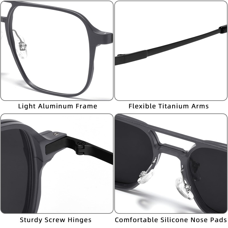 TEAPLMTT Magnetic Clip On Polarized Sunglasses for Men Duble Brige Square Night Driving Al-Mg Eyeglasses(Gunmetal)
