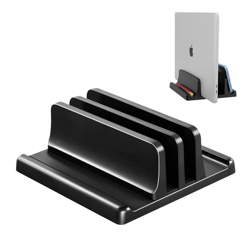 - 【4 in 1 Space-Saving Design】This vertical laptop stand combines functionality and efficiency, featuring two slots for laptops or tablets and two additional spaces for storing phones or pens. It optimizes desk space while accommodating multiple devices.