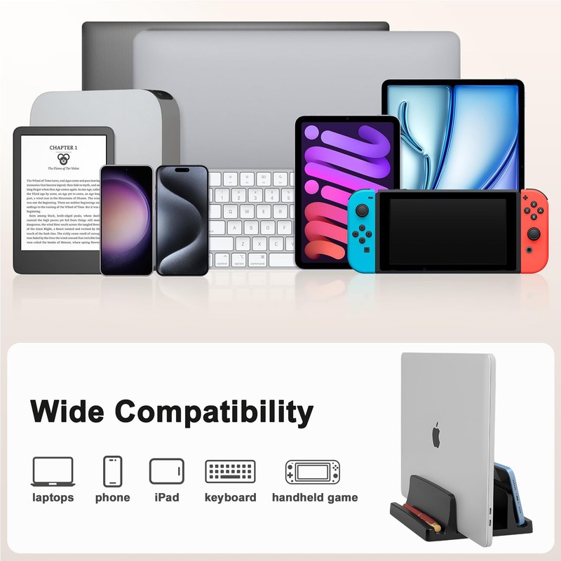 Laptop stand vertical is compatible with laptops, tablets, drawing pads, keyboards, documents, books, and more, with a maximum size of up to 17.3 inches.